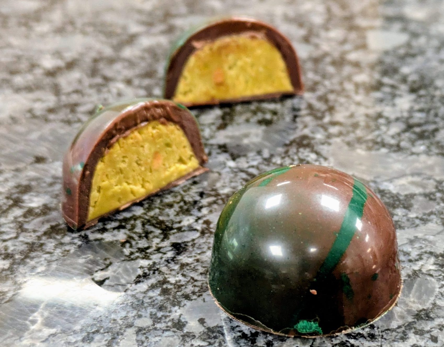 Mørkt skall med fyll av pistasj, hvit sjokolade, tahini og sprø kadayf
