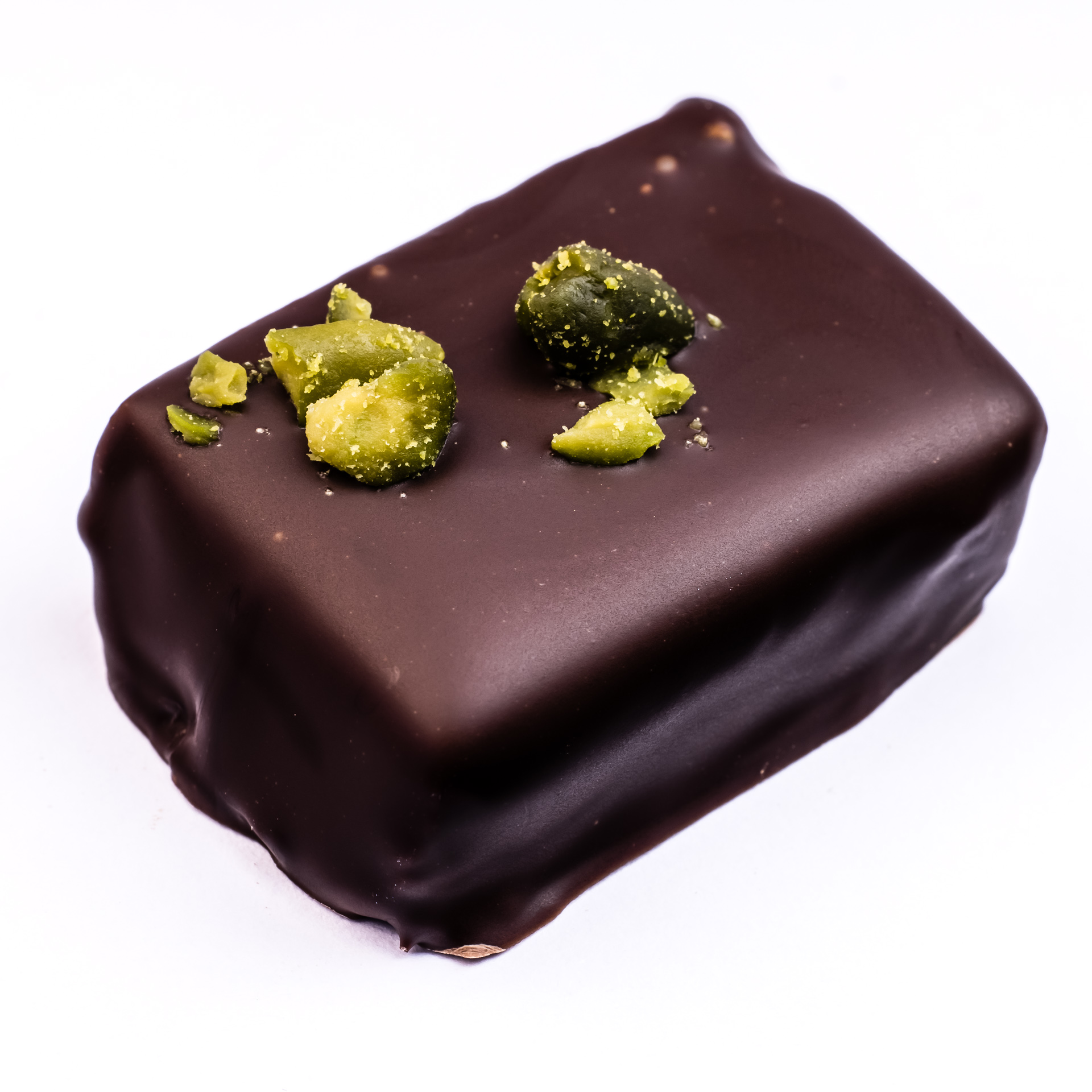 Lett ristet pistasjgianduja med hvit sjokolade, litt salt og et dryss tonkabønne dyppet i mørk 65% sjokolade. Konas favoritt!